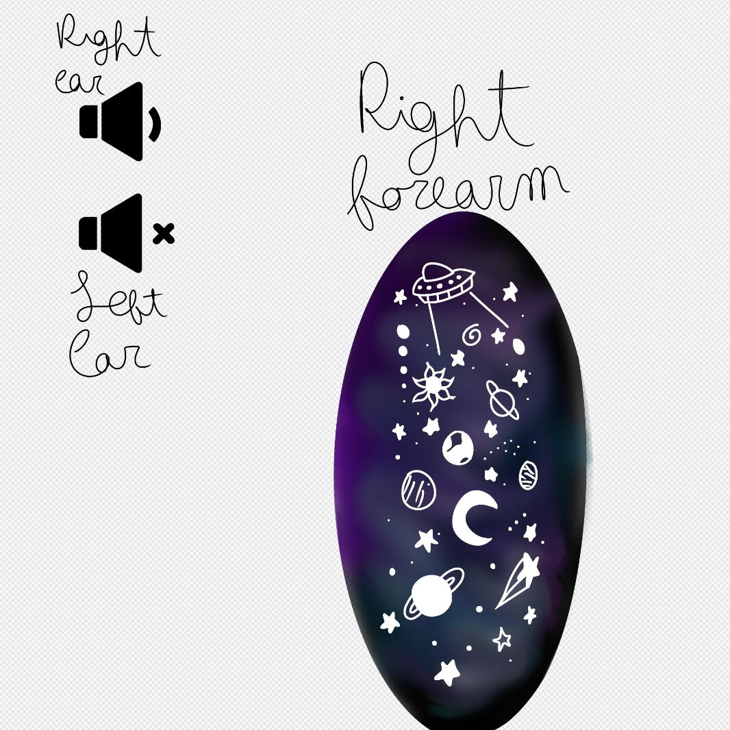 Mars has a galaxy tattoed on his right forearm. Behind his right ear is a low volume symbol and he had a muted volume symbol behind his left ear. Both represent his hearing loss.